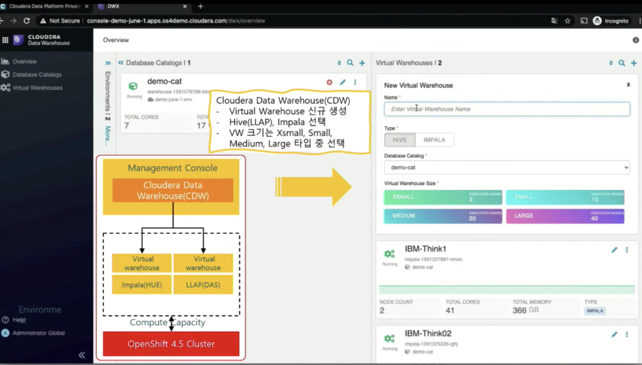 virtual warehouse는 내부적으로 openshift가 자원을 요청하고 사용완료후에 반납함