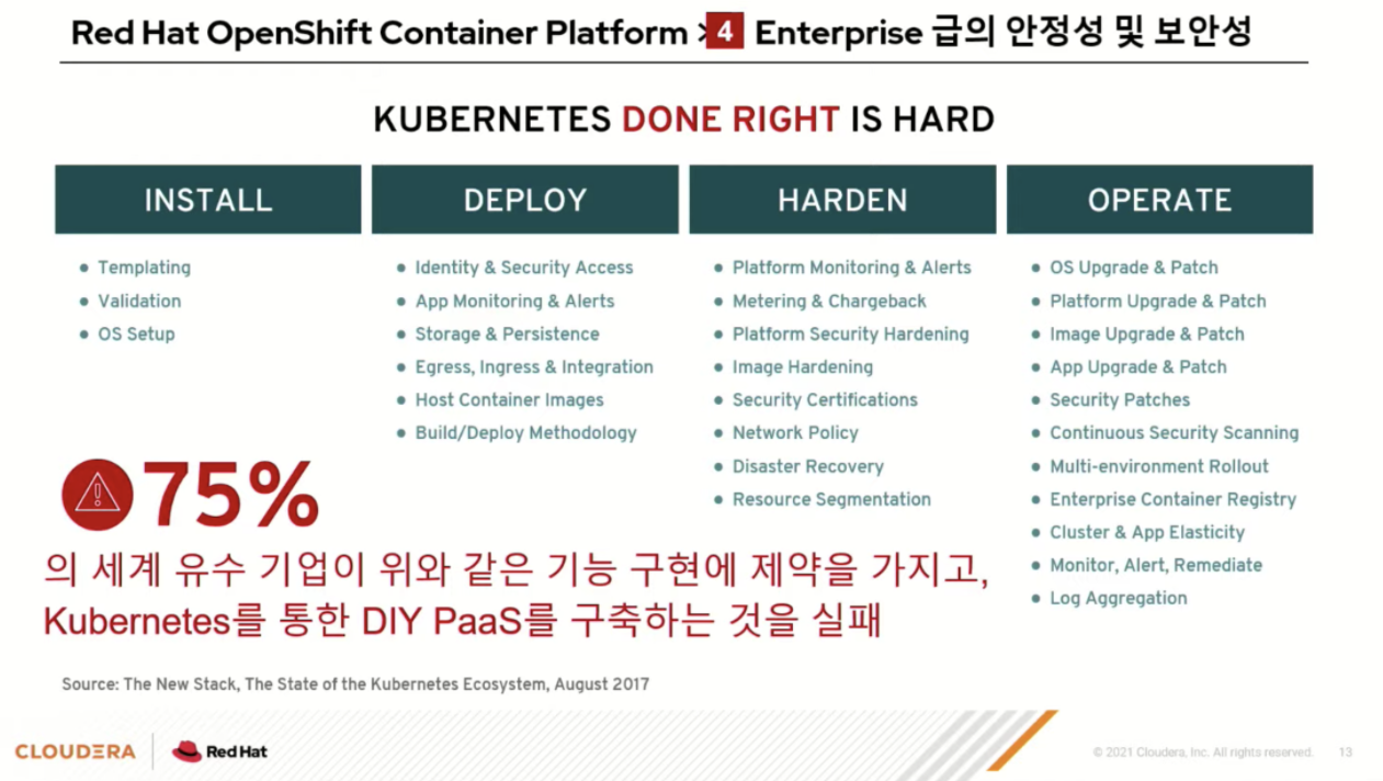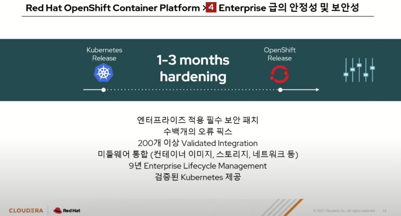 OPENSHIFT의 경우 k8s가 오픈소스이다 보니 보안이나 안정성 면에 대해 1-3개월간 자체 검증 후 적용한다고 한다.