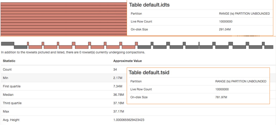 | timestamp, id | timestamp 기준으로 정렬 | - 공간 사용률 낮음 - id 정렬이 되지 않고 데이터 압축 성능 떨어짐 -insert에 최적화 |
