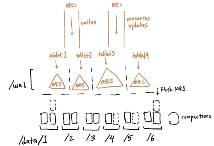 - 여러 개의 data directory들이 tablet replica들에 의해 공유