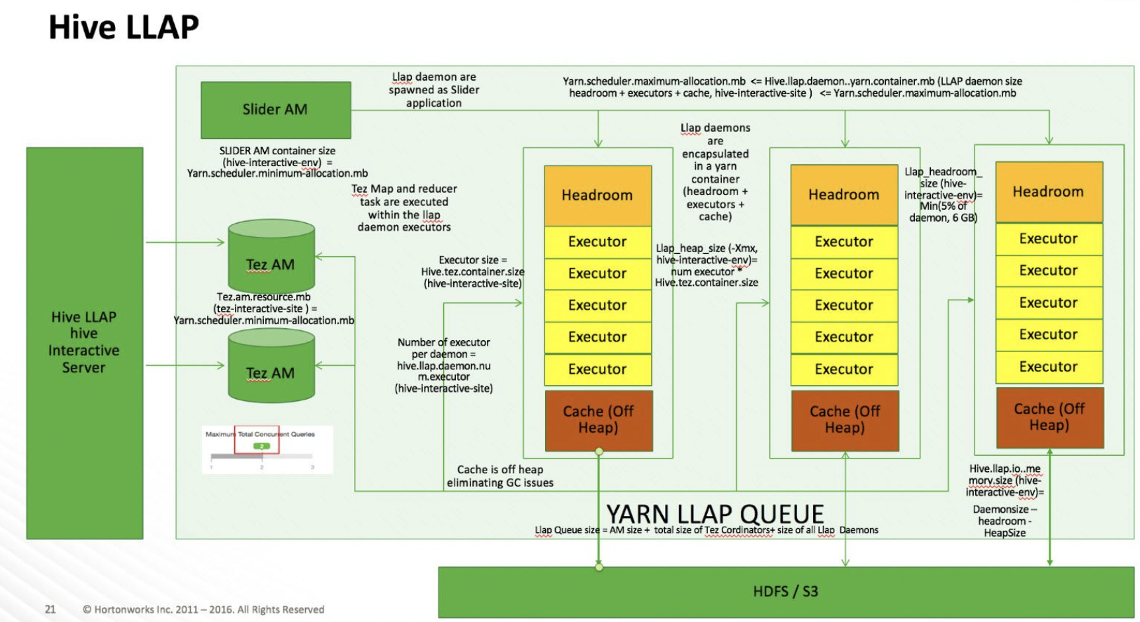 hive2.0 에서 도입 자주 사용 되는 데이터를 캐싱 하여 작업속도를 올리는 기술 LLAP를 활용해 Hive 를 이용할 경우 캐싱을 위한 YARN Queue 를 별도로 할당 받고 설정한 리소스를 상시 점유 LLAP 구성 구분 설명 Hive Interactive Server Hive LLAP에 연결하기 위해 JDBC 인터페이스를 제공하는 Thrift 서버 Slider AM LLAP 데몬을 생성, 모니터링, 유지하는 슬라이더 프로그램 TEZ AM query coordinator TEZ AM은 사용자의 요청을 받아 LLAP 데몬(JVM) 내에서 사용할 수 있는 실행기에서 실행 LLAP 데몬 캐싱, JIT 최적화를 용이하게 하고 바로 호출할 수 있도록 클러스터의 worker node에서 실행 I/O, 캐싱, ..